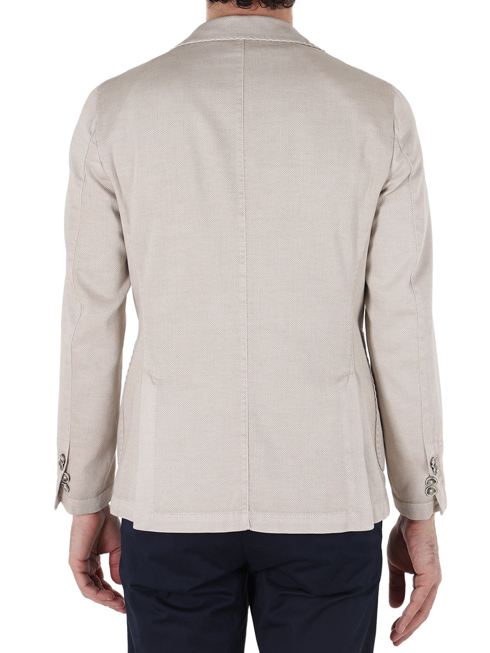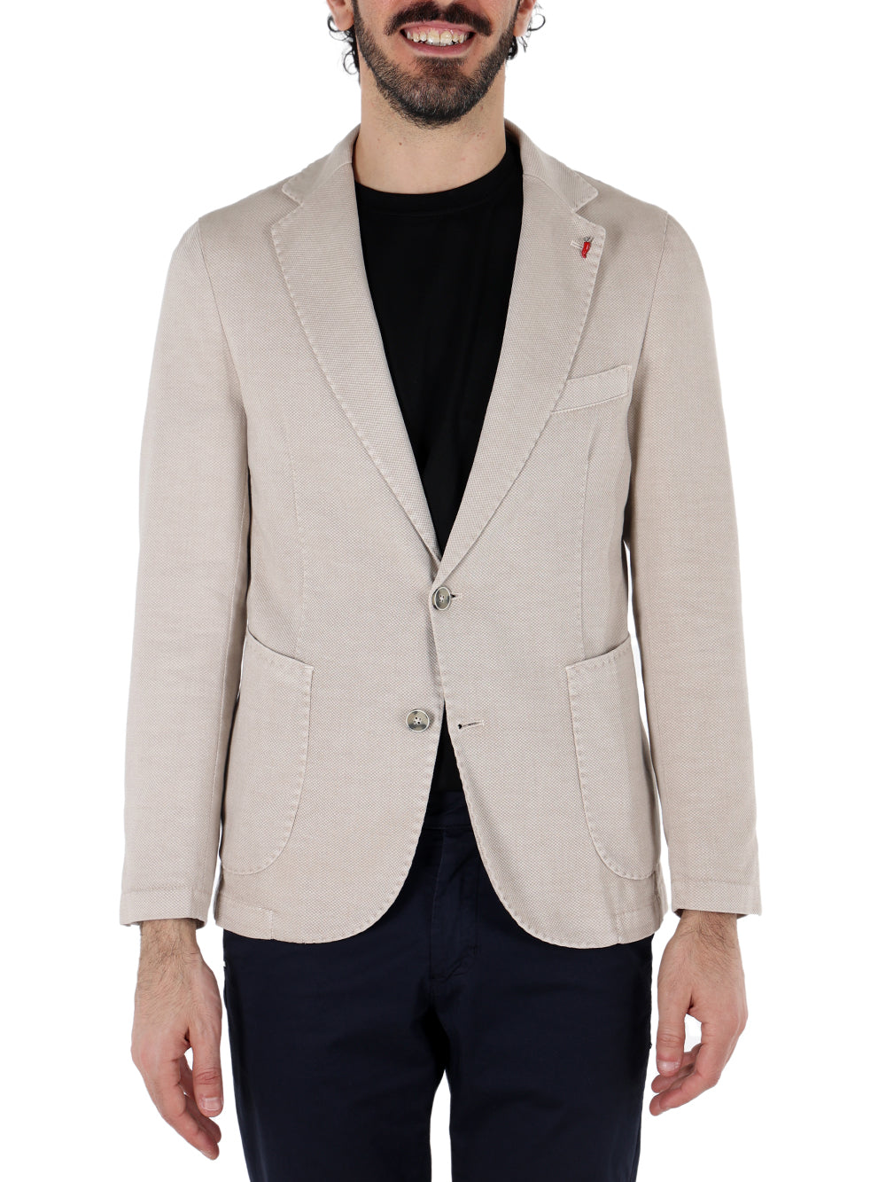 Giacca slim fit in tessuto leggero lavorato punto riso. Collo con revers regolari, chiusura centrale a due bottoni, tasche laterali . Capo non foderato. Composizione tessuto 95% poliestere 5% elastan