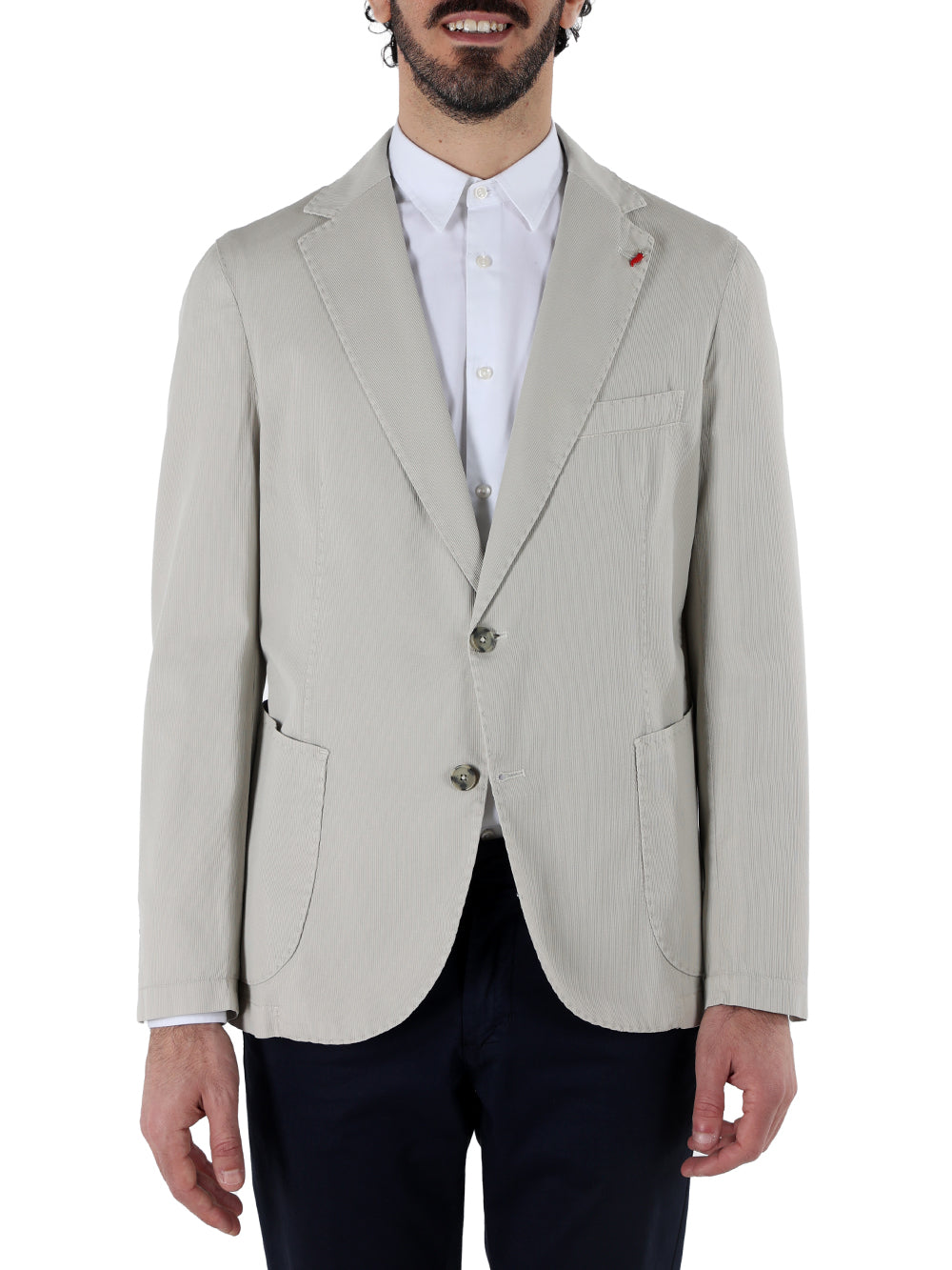 Giacca slim fit in tessuto leggero lavorato punto riso. Collo con revers regolari, chiusura centrale a due bottoni, tasche laterali . Capo non foderato. Composizione tessuto 95% poliestere 5% elastan